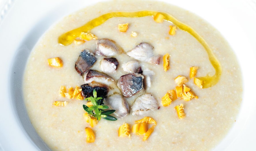 Preparazione: pulire e tagliare a dadini i finferli. Soffriggere i finferli con un po’ d’aglio, aggiungere brodo di pesce e sale quanto basta. Nel frattempo sfilettare lo sgombro ed il suro, lavarli bene e tagliarli a dadini. Saltarli velocemente in una padella antiaderente, servire la crema di finferli ben calda con i dadini di pesce adagiati sopra.