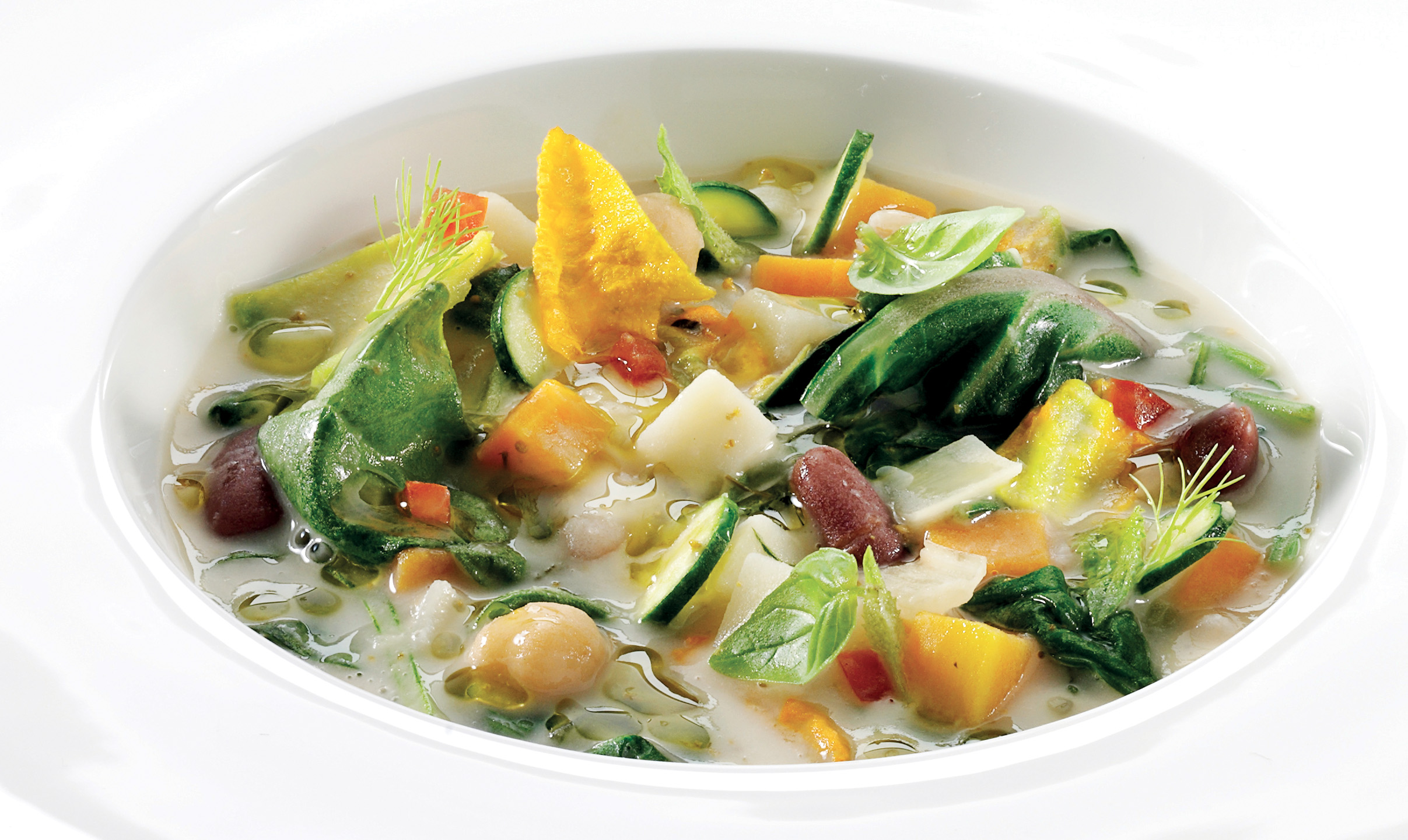 Per la zuppa di verdure: g. 50 di foglie di cavolo nero senza nervature, g. 50 di foglie di cavolo verza senza nervature, g. 30 di foglie di bietole, g. 60 di cipollotto fresco, g. 60 di porri medi (usare solo il bianco), g. 50 di carote medie, g. 50 di zucchine piccole e sode, possibilmente la varietà “striata di Napoli” verde chiaro, g. 50 di patate medie a pasta bianca, g. 50 di gambi di sedano verde (preferibilmente quello piccolo molto profumato), g. 100 di foglie di spinacino, g. 200 di fiori di zucca, g. 50 di piselli freschi sbaccellati, g. 50 di fave fresche sbaccellate, g. 8 di semi di finocchio tritati, g. 20 di foglie di prezzemolo e basilico spezzettate, 1 spicchio d’aglio, ml. 500 di brodo vegetale, g. 20 di olio extravergine d’oliva, g. 15 di sale, g. 3 di pepe.