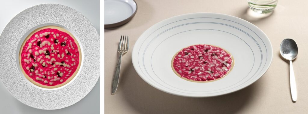 La cucina di Enrico Bartolini è definita dallo chef stesso come “Contemporary Classic”, un equilibrio tra tradizione italiana e tecniche d’avanguardia. Il suo piatto più celebre in assoluto è il Risotto alle rape rosse e salsa al gorgonzola “Evoluzione” noto per il suo impatto visivo che ricorda un’opera di Jackson Pollock: è il suo manifesto,il suo signature dish più famoso, dove la dolcezza della rapa rossa si sposa con l’intensità del gorgonzola in un contrasto cromatico e gustativo esemplare.