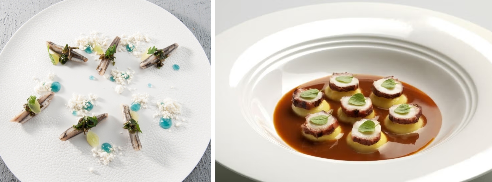 Il risotto al cavolfiore e polvere di capperi racconta invece la sua idea di sottrazione. Un ingrediente umile diventa protagonista assoluto grazie a una tecnica che c’è, ma non si vede, perché «La vera innovazione è saper togliere, non aggiungere.» Possiamo poi citare i Bottoni di olio e lime con salsa al cacciucco e polpo arrostito, un piatto che racchiude i sapori del mare con una esecuzione raffinata ma “esplosiva”; le Alici di scoglio tra saor e carpione, una reinterpretazione creativa di due grandi classici della conservazione del pesce in Italia.