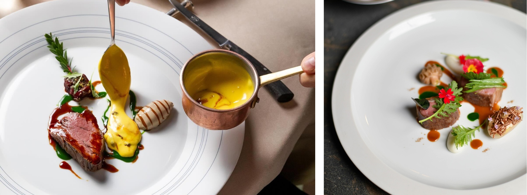 Con il piccione, foie gras e liquirizia, Bartolini esplora l’intensità di un piatto verticale, adulto, a misura di una maturità da tempo acquisita, mentre il Filetto di manzo podolico in frollatura, spesso accompagnato da salse classiche come la Royale o da ingredienti stagionali, ha il fascino estetico e gustativo realizzato con precisione geometrica.