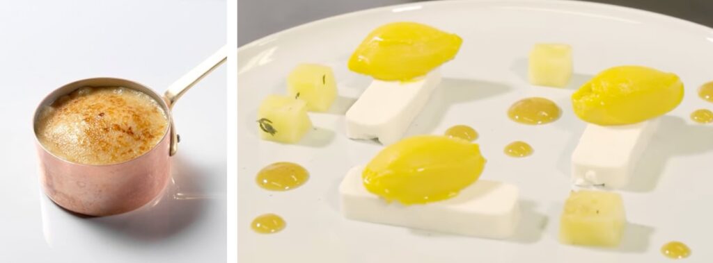 Bartolini presta molta attenzione anche alla parte finale del pasto, ricercando leggerezza e freschezza senza rinunciare alla golosità come nella Creme Brulée, una versione estremamente raffinata del classico dolce, spesso citata tra le sue specialità. La Panna cotta leggermente affumicata con ananas arrostito, servita con salsa al timo e gelato al mango, è un esempio di come lo chef utilizzi note affumicate e vegetali anche nei dessert; il Bombolone rappresenta invece un omaggio alle sue origini toscane e ai ricordi d’infanzia.