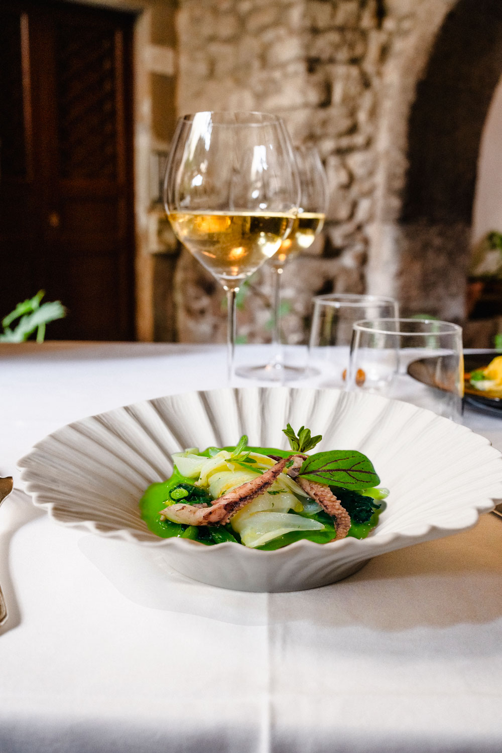 Un piatto che unisce mare e terra attraverso un gioco di consistenze, vegetali di stagione, acqua estratta dalle bucce di piselli, cavolo nero, fave e confettura di limoni.