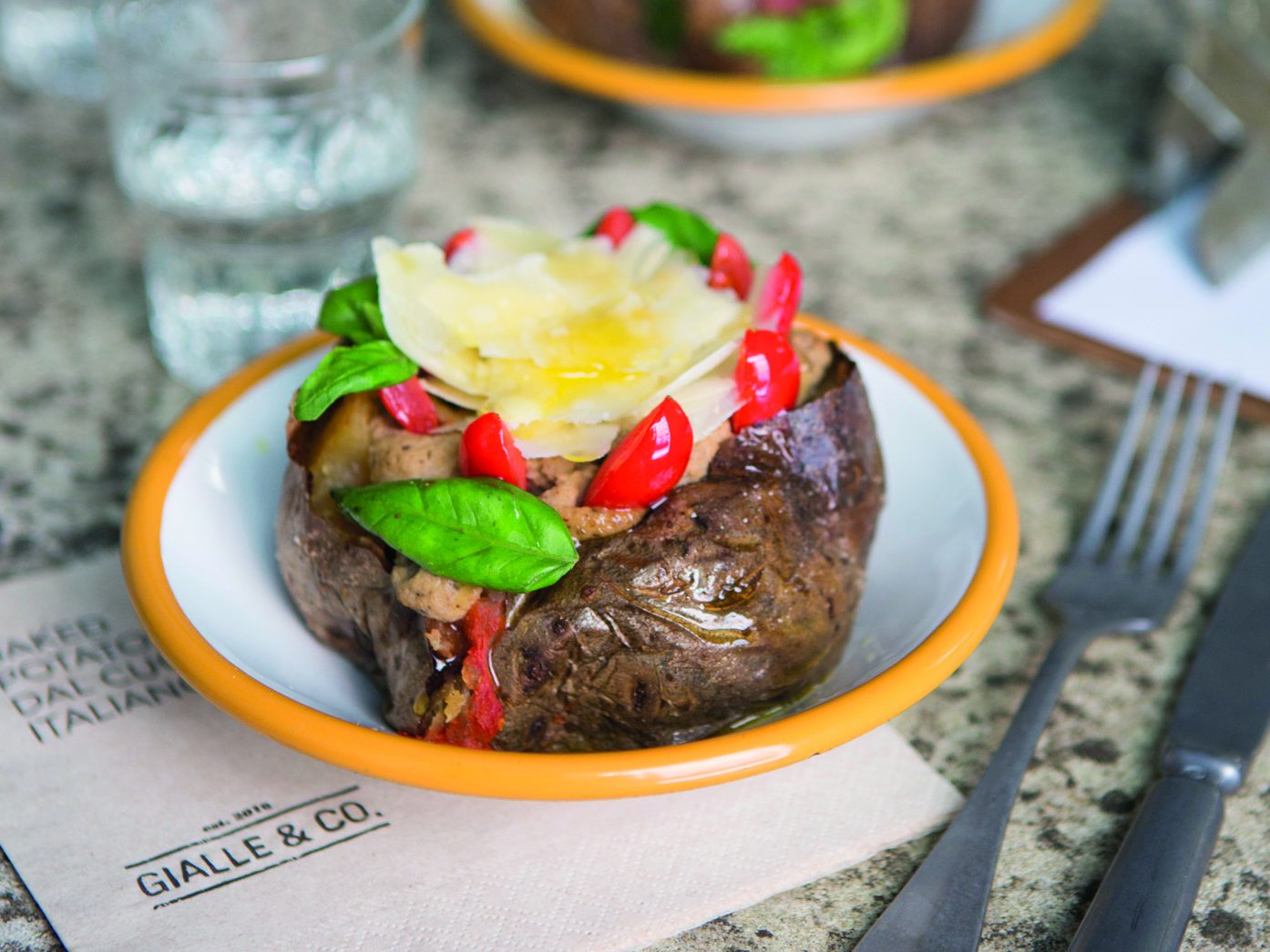 INGREDIENTI • g. 300 di patata calibrata • crema di melanzane • mousse di pomodorini • basilico • grana in scaglie PREPARAZIONE Cuocere la patata a 180°C condita con sale e poco olio…
