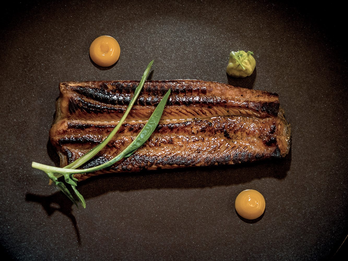 INGREDIENTI per 4 persone • 1 anguilla di kg. 1 pulita ed eviscerata • soia • mirin • faggio per affumicare • mango • miso bianco • puntarelle PREPARAZIONE Rimuovere testa e coda…