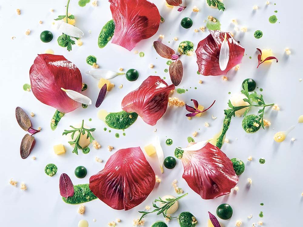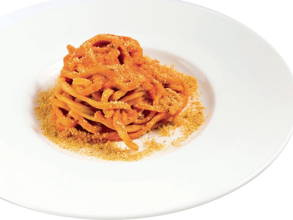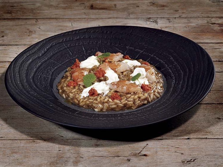 Risotto mantecato con crema di melanzane leggermente affumicata, battuto di gamberi, stracciatella di burrata e pesto rosso alla siciliana