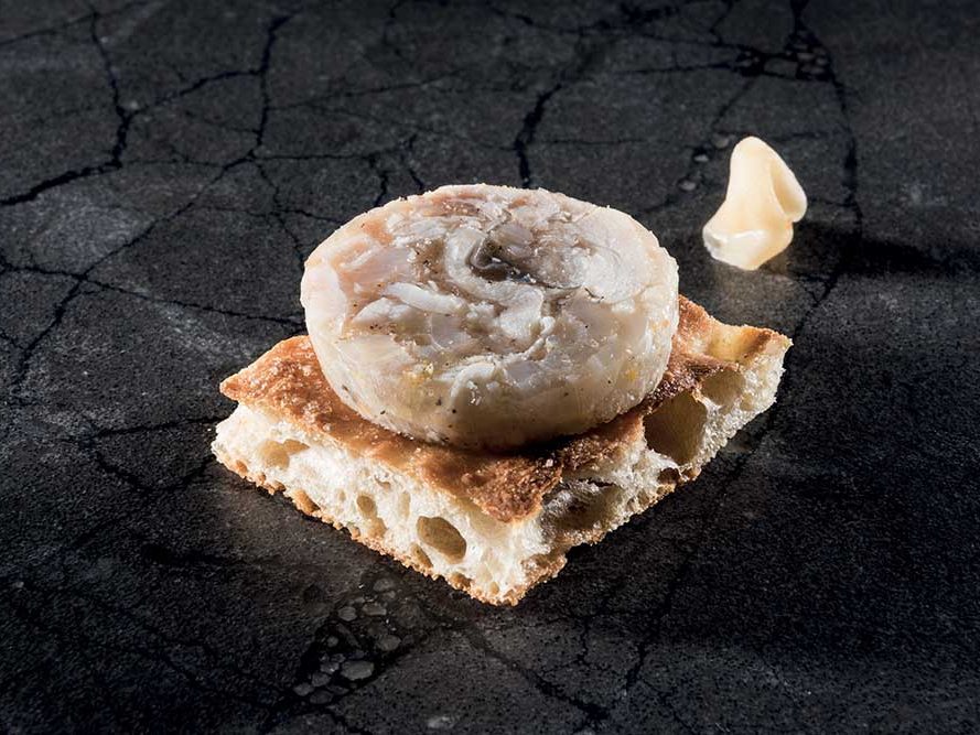 INGREDIENTI per 8 persone • kg. 2-3 di testa di rana pescatrice grande • aglio per “salsa aglio” • noce moscata • arancia • sale e pepe • misticanza di campo • polvere…