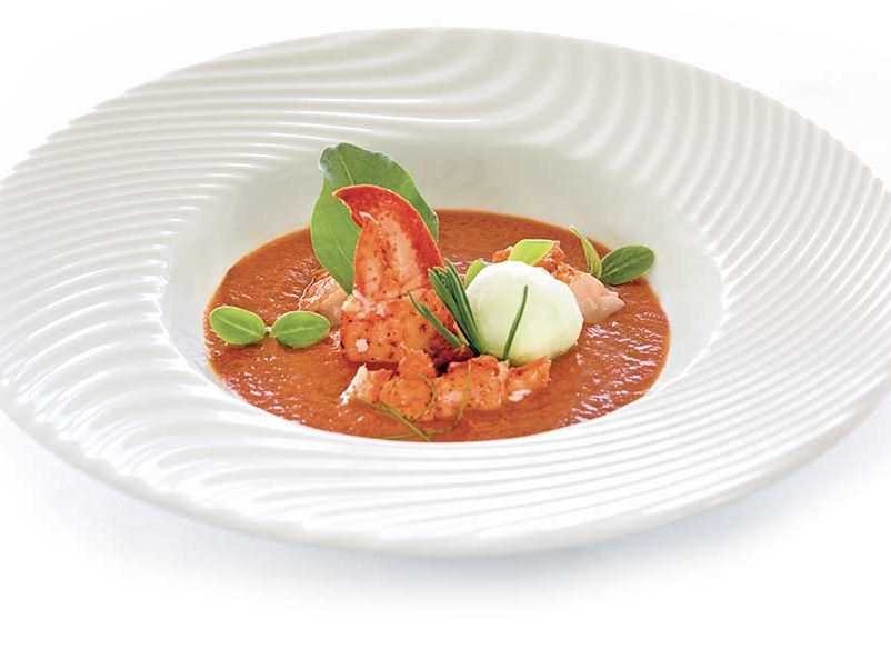Gazpacho andaluso con insalata di astice dragoncello e sorbetto al cetriolo