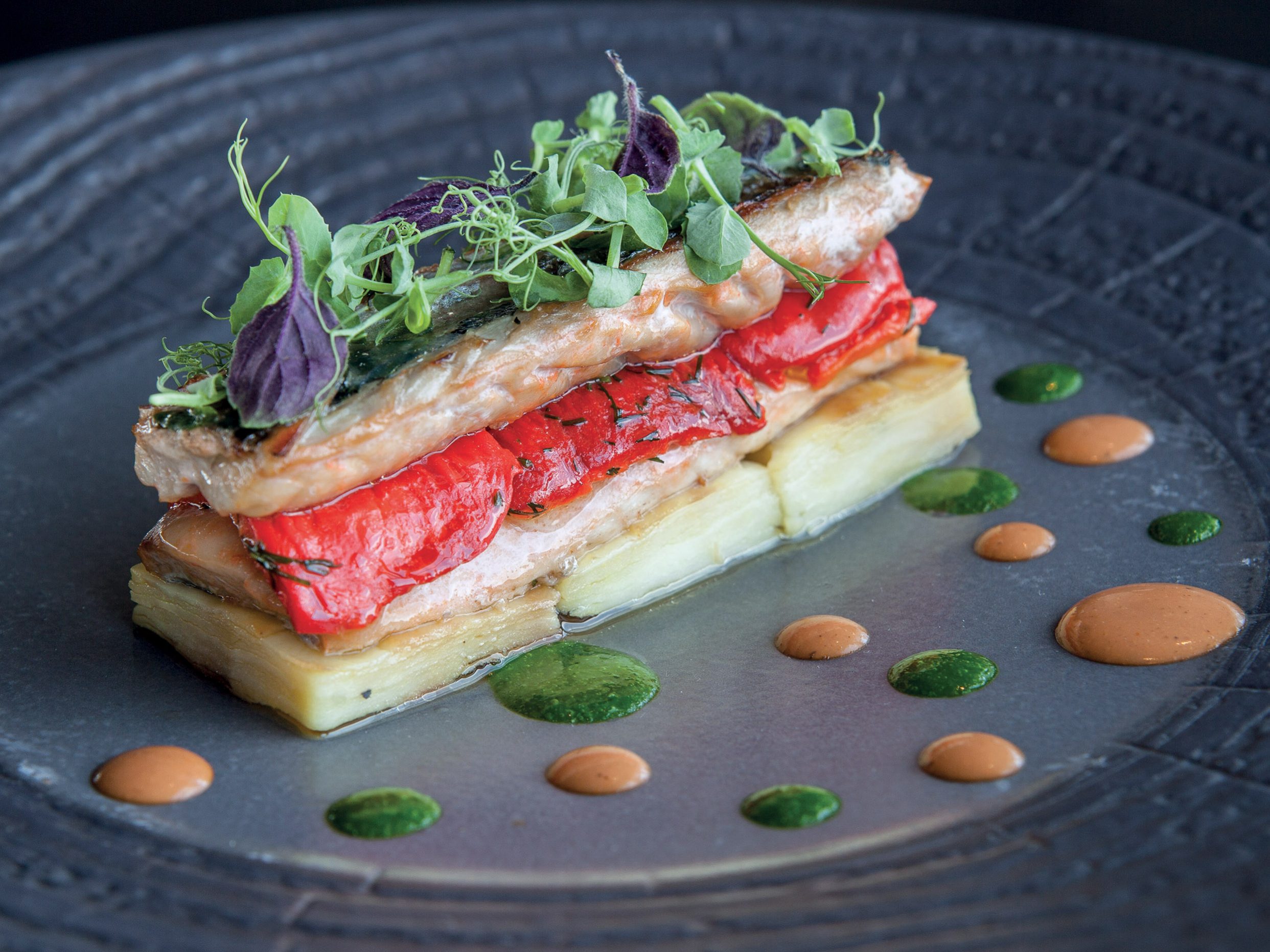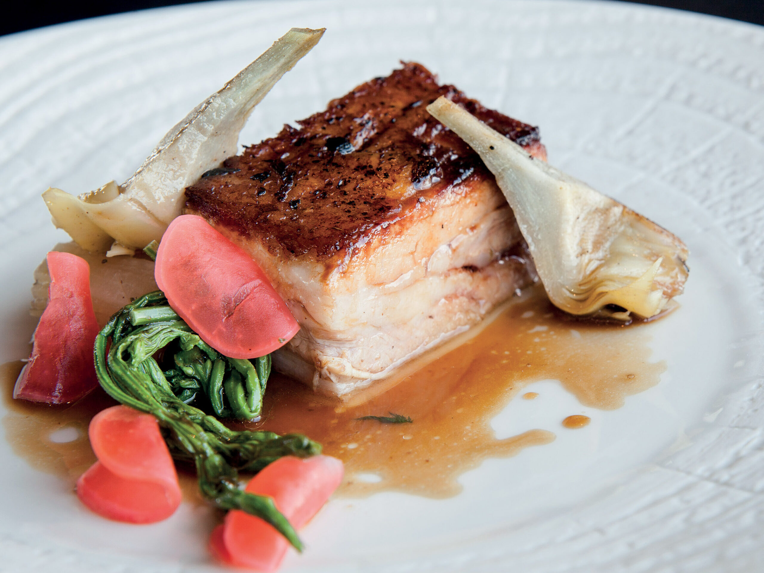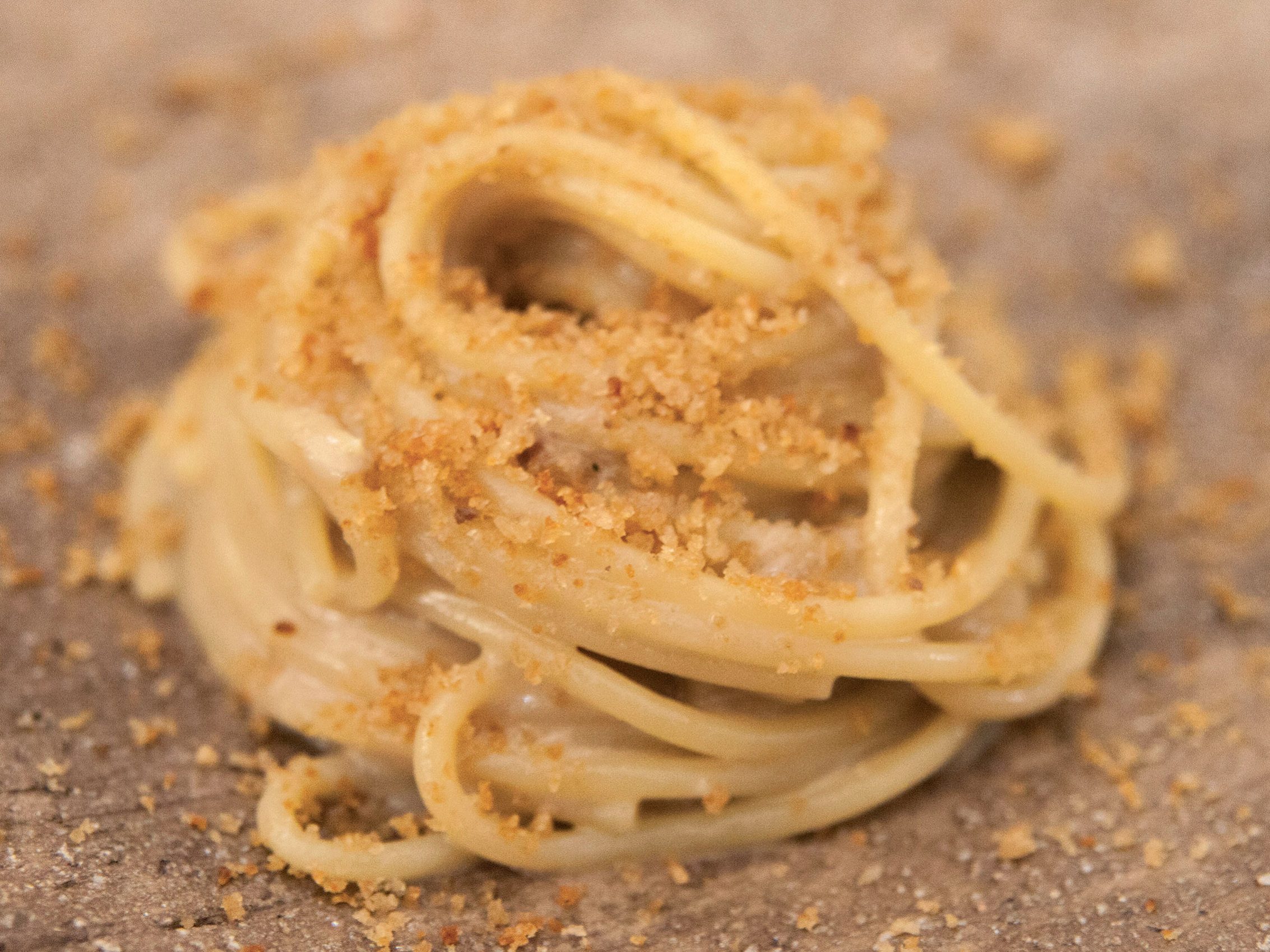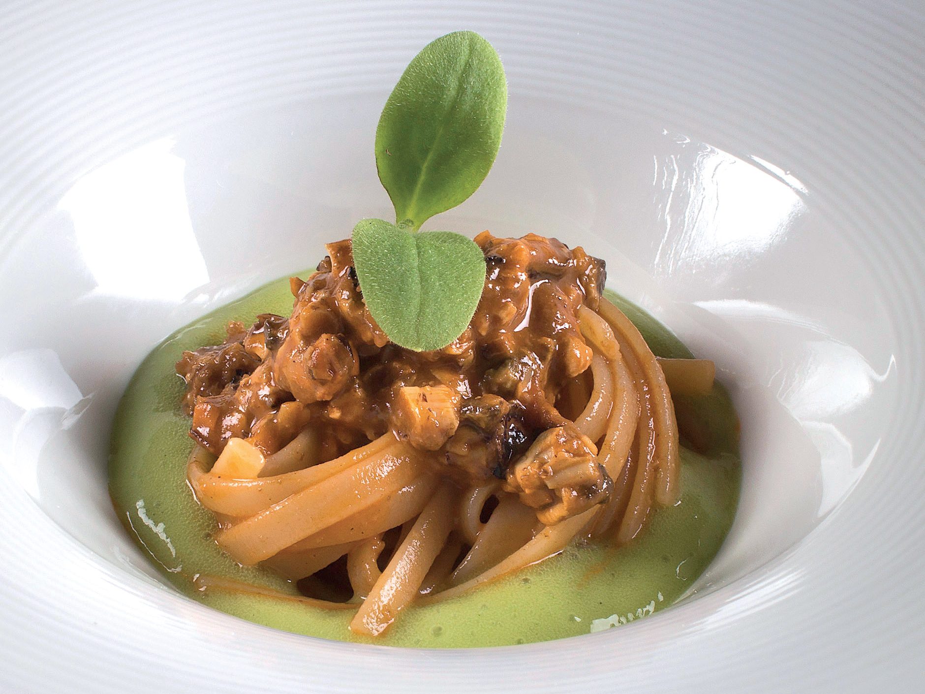 “Si tratta di un piatto apparentemente semplice fatto di delicati equilibri e pochi orpelli che riconcilia i profumi di una Sardegna primordiale con un estetica essenziale. La consistenza dello spaghetto, del croccante all’acciuga…