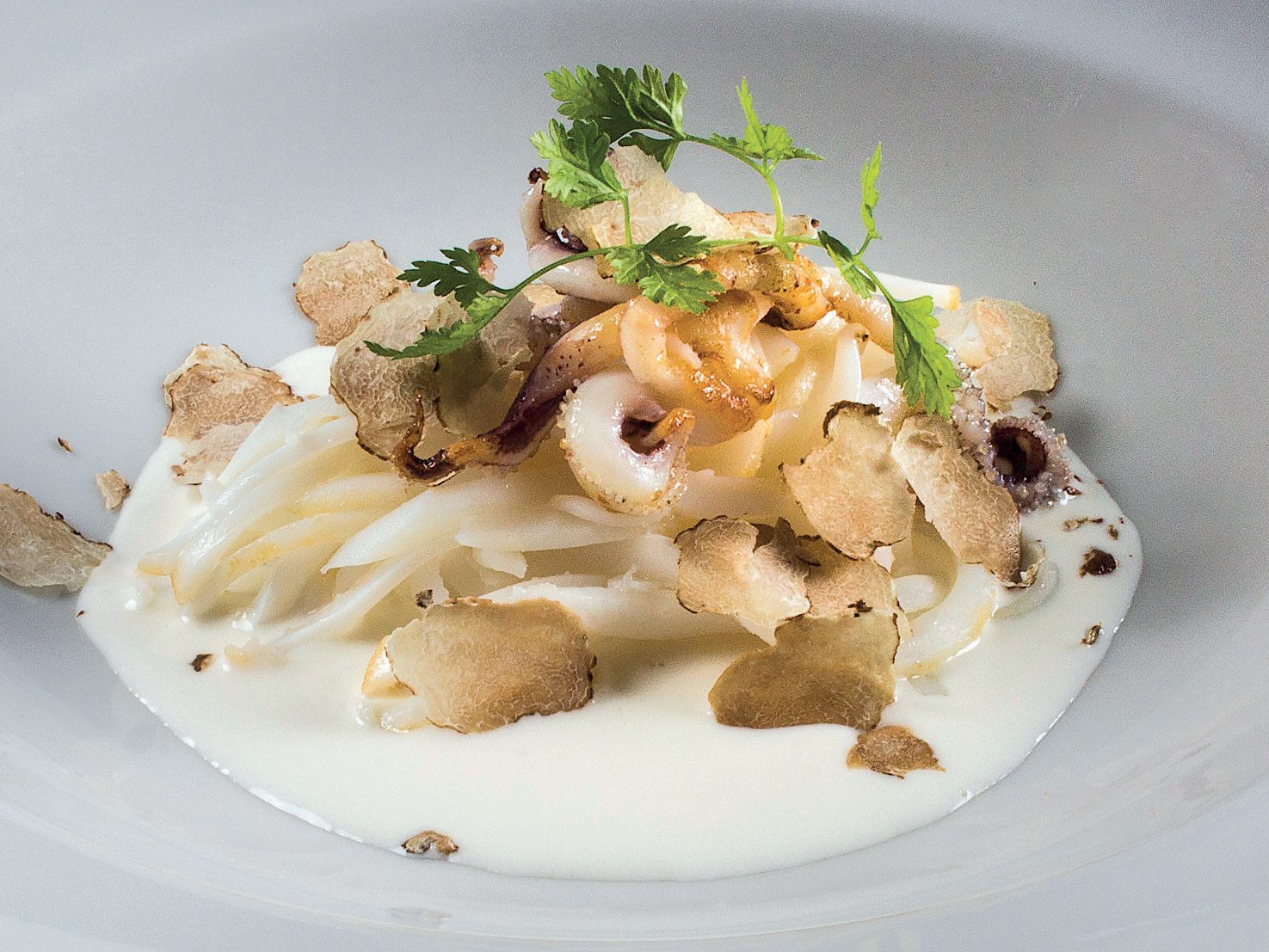 INGREDIENTI per 4 persone 4 calamari di medie dimensioni g. 250 di fomaggio di fossa di Sogliano g. 200 di panna g. 100 di latte g. 8 di tartufo bianco burro chiarificato q.b.…