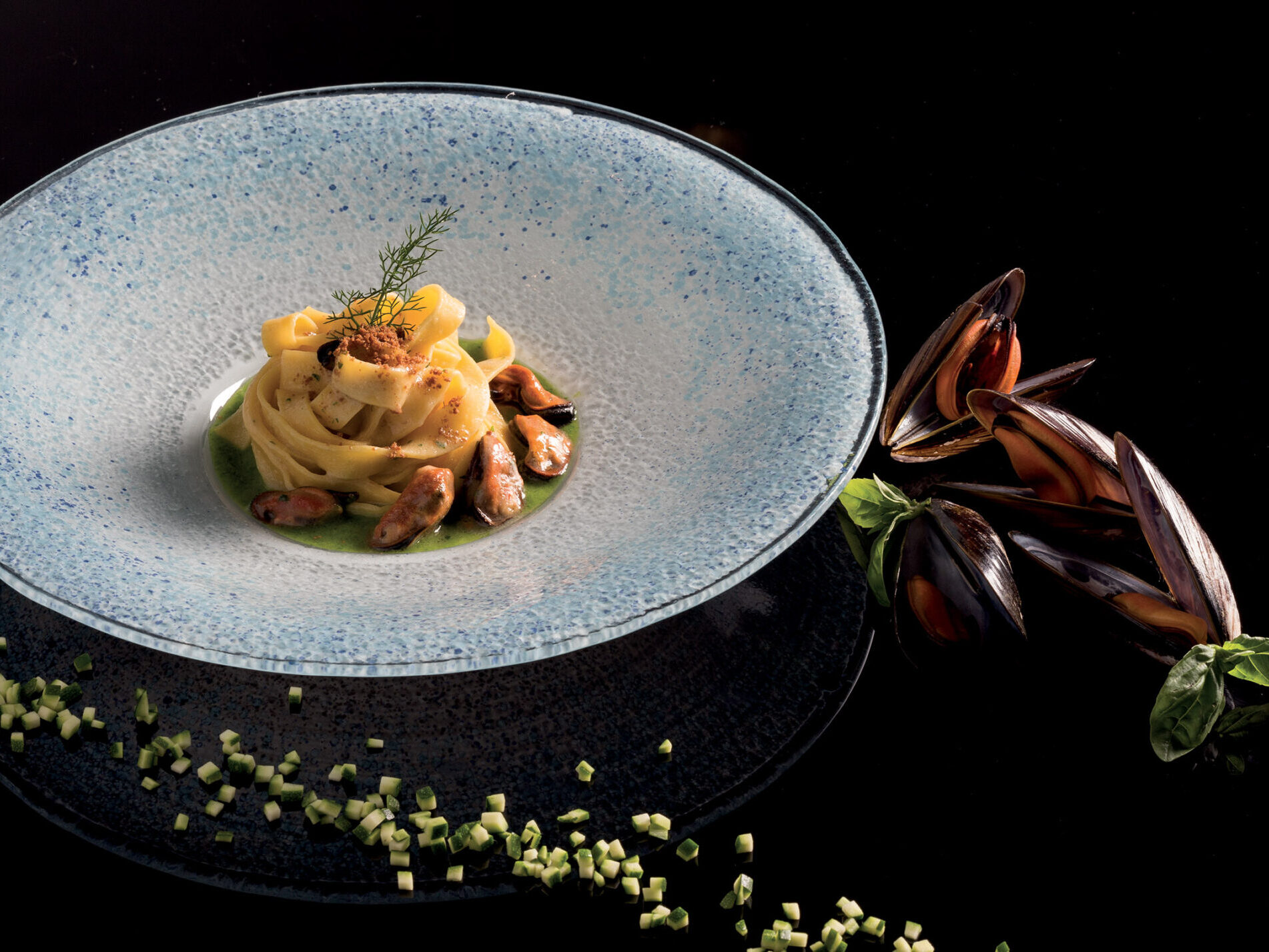 INGREDIENTI per 10 persone g. 700 di Intrighi Divine Creazioni Surgital kg. 4 di cozze g. 50 di bottarga 1/2 bicchiere di Armagnac g. 700 di zucchine aglio, prezzemolo, sale, peperoncino, olio extravergine…