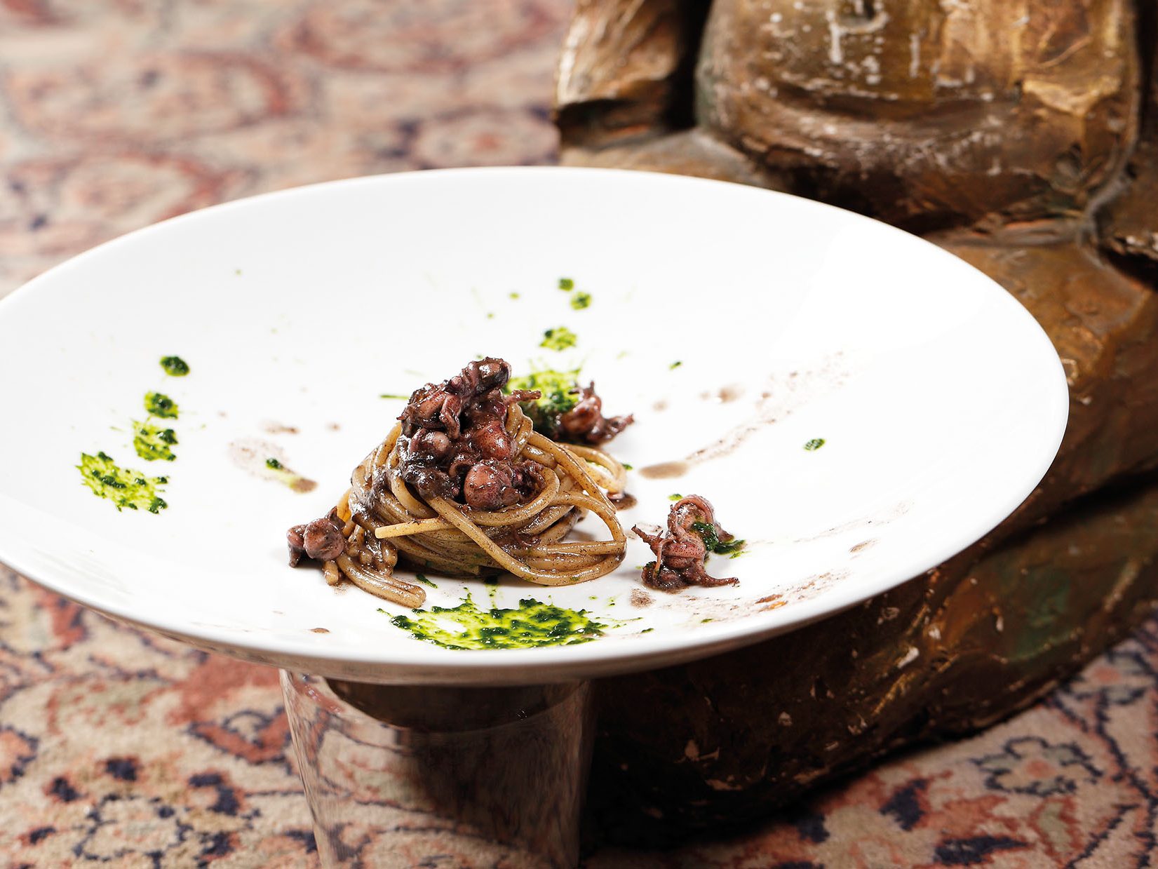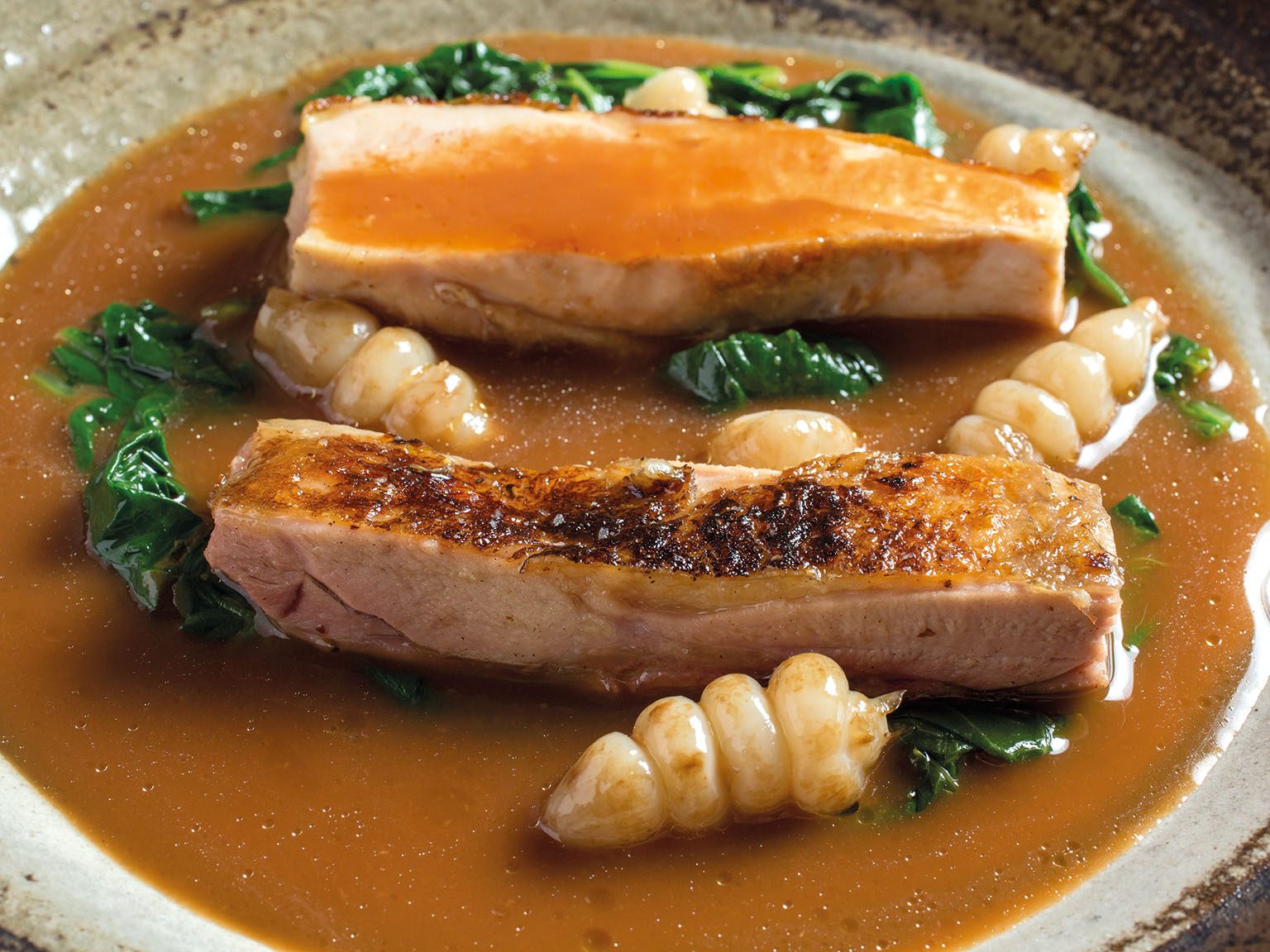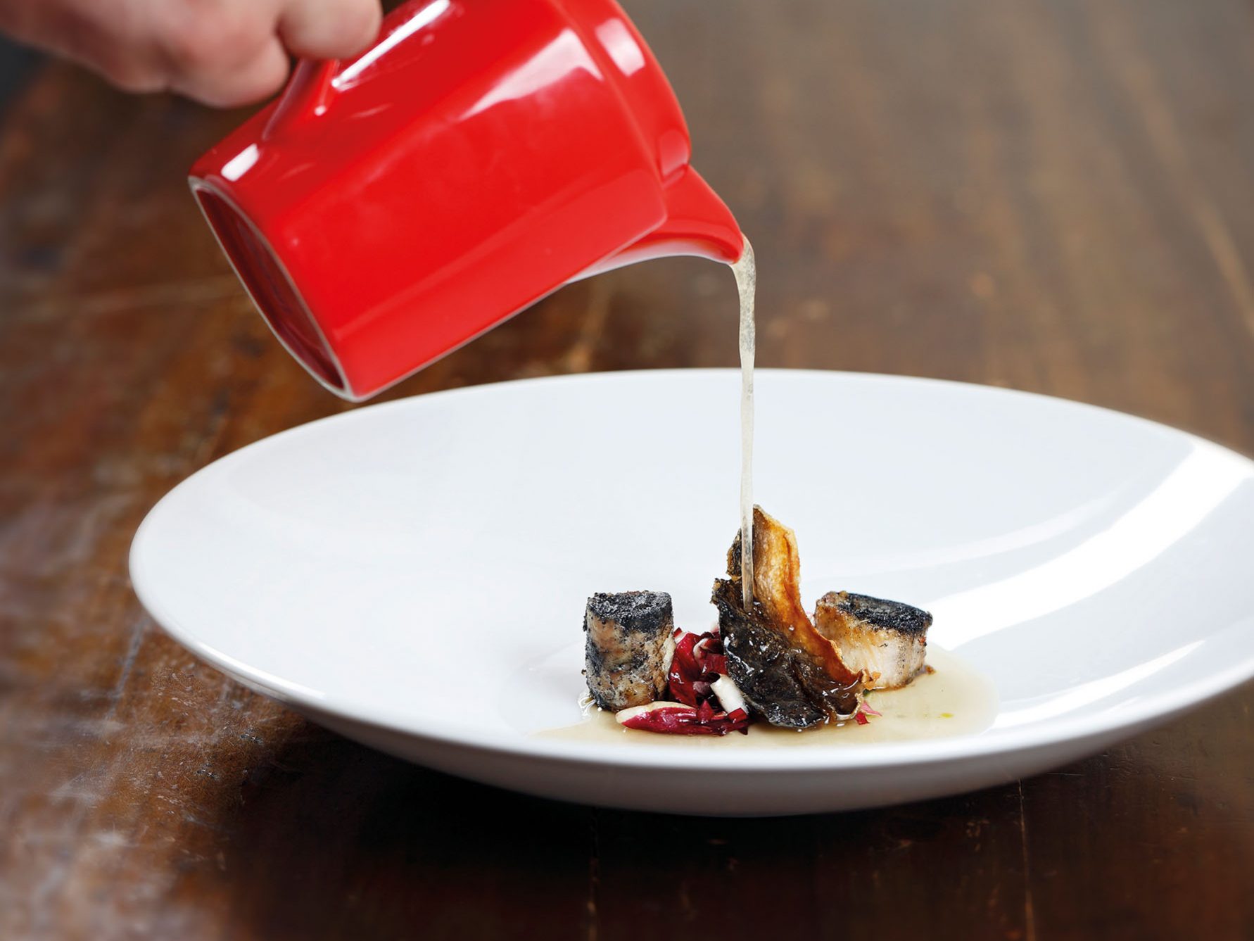 INGREDIENTI g. 800 di anguilla aperta e privata della spina dorsale, 2 radicchi tardivi, g. 400 di fumetto di pesce e gusci, aceto di riso, polvere di carboni vegetali (per ricreare la sensazione…