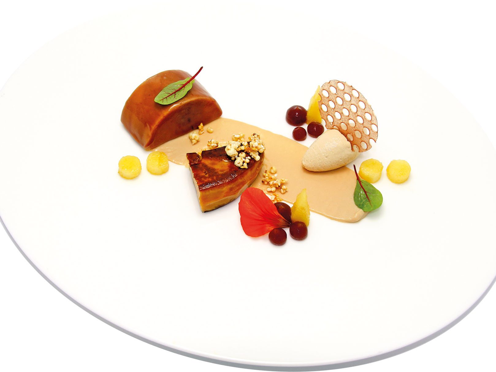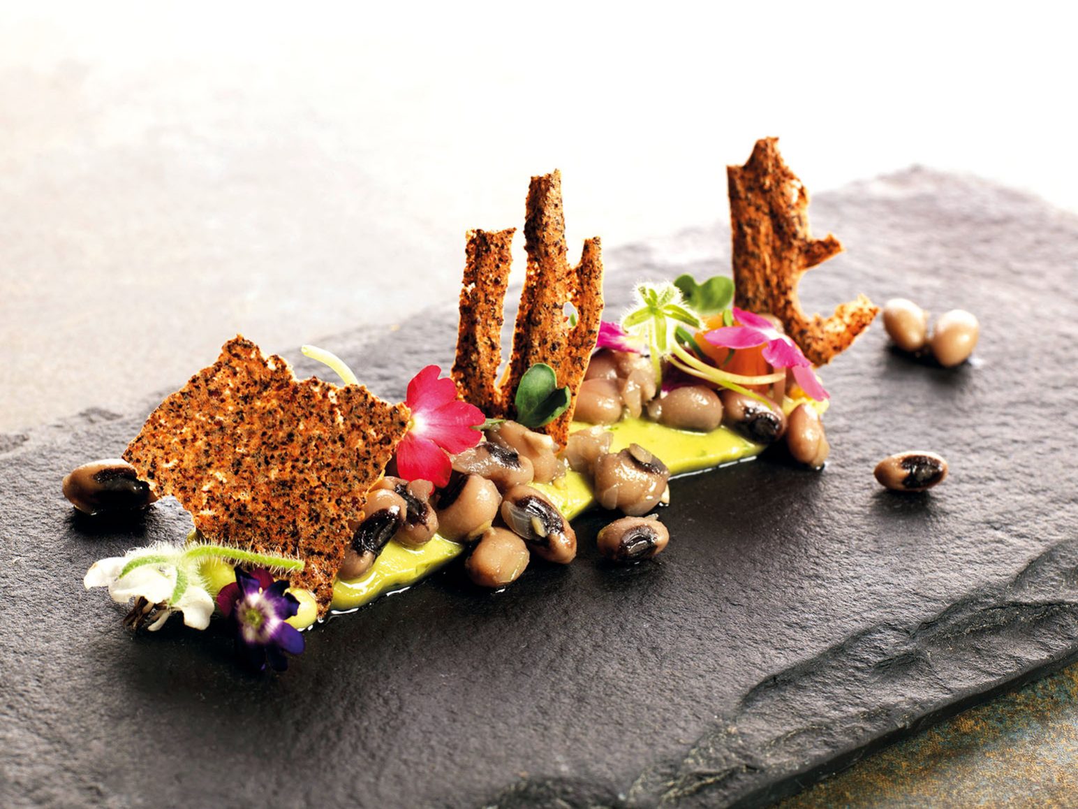 INGREDIENTI per 4 persone Per i fagioli: g. 60 di crema di avocado, g. 60 di fagioli saltati, g. 8 di marmellata dolce di melocotogno, g. 8 di terra di grani, g. 4…