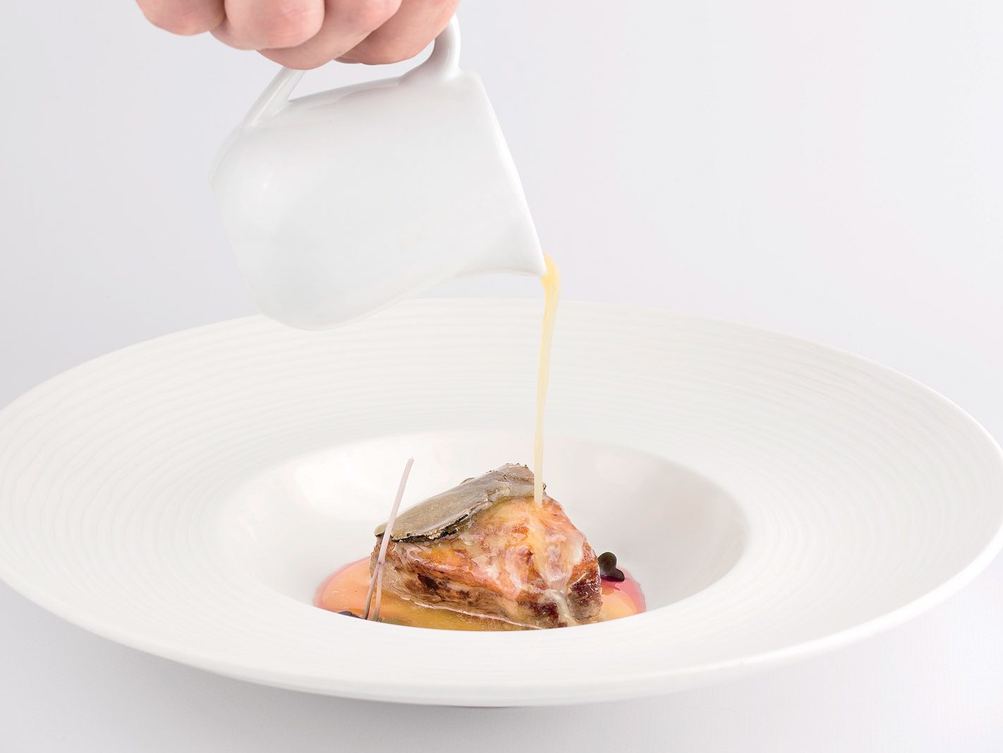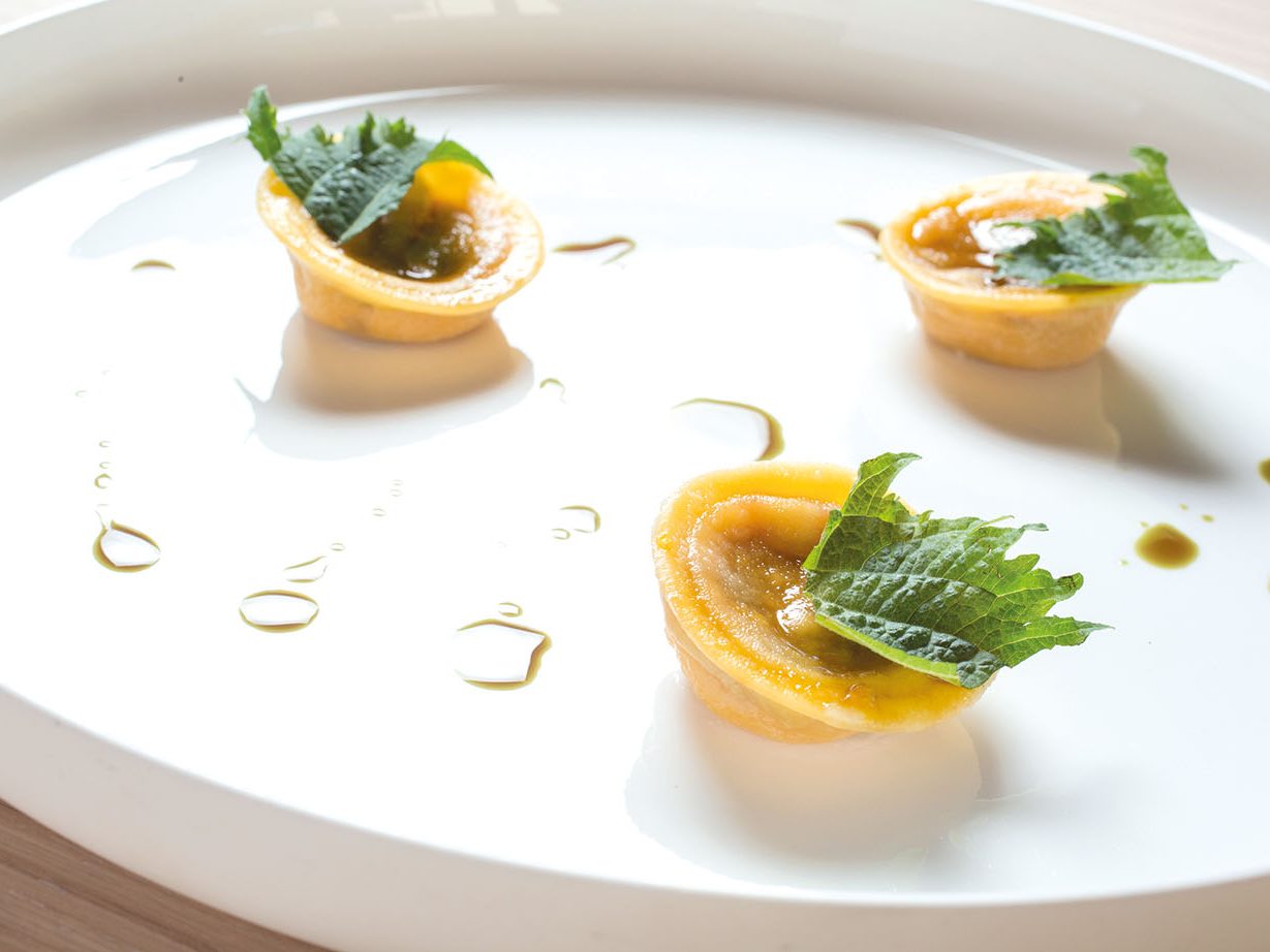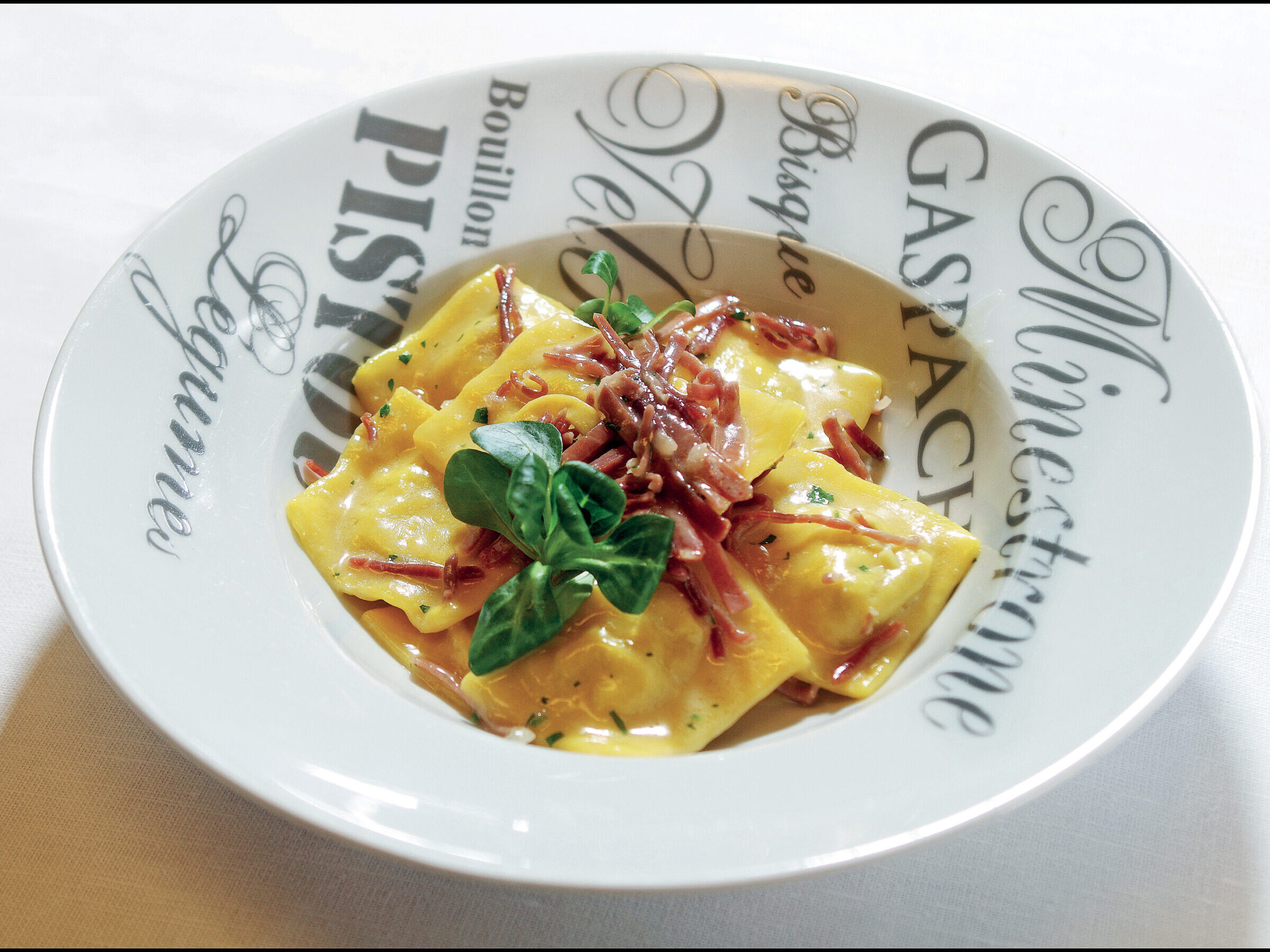 Ravioli di zucca, testina di maiale, prugne fermentate e amaro del Cadore