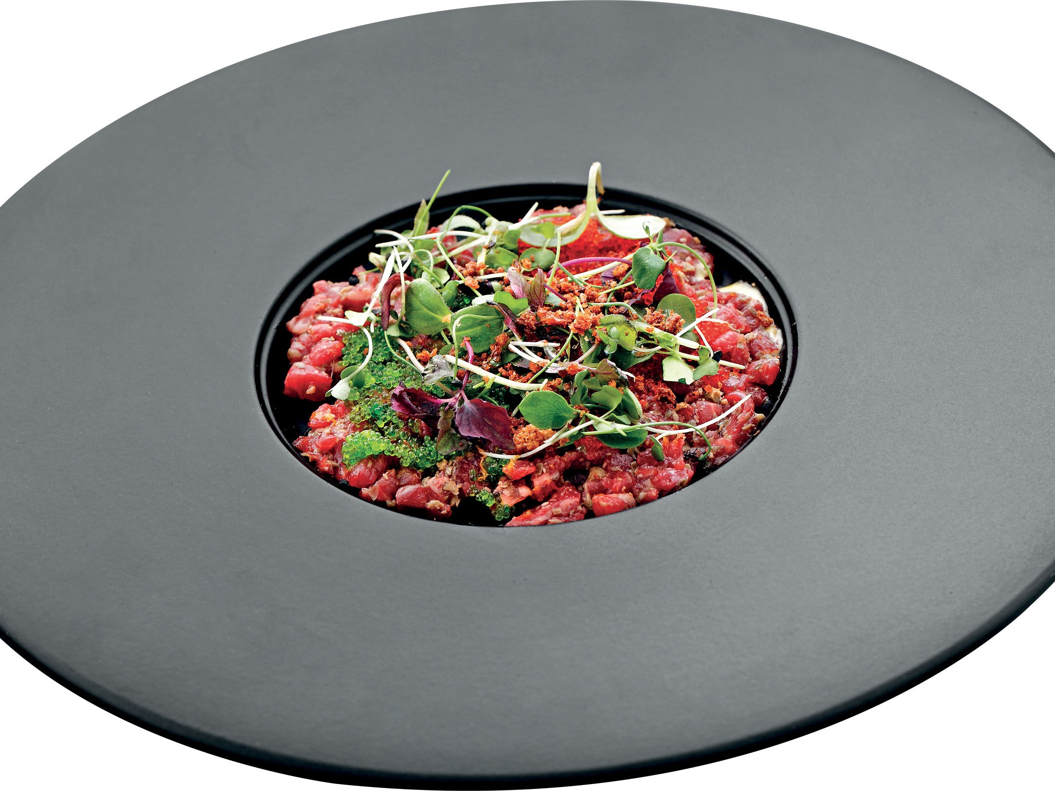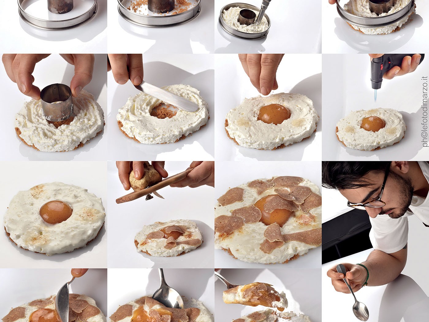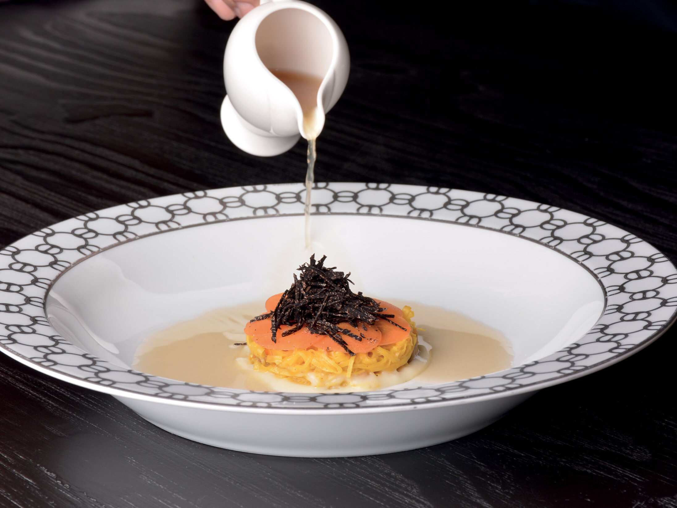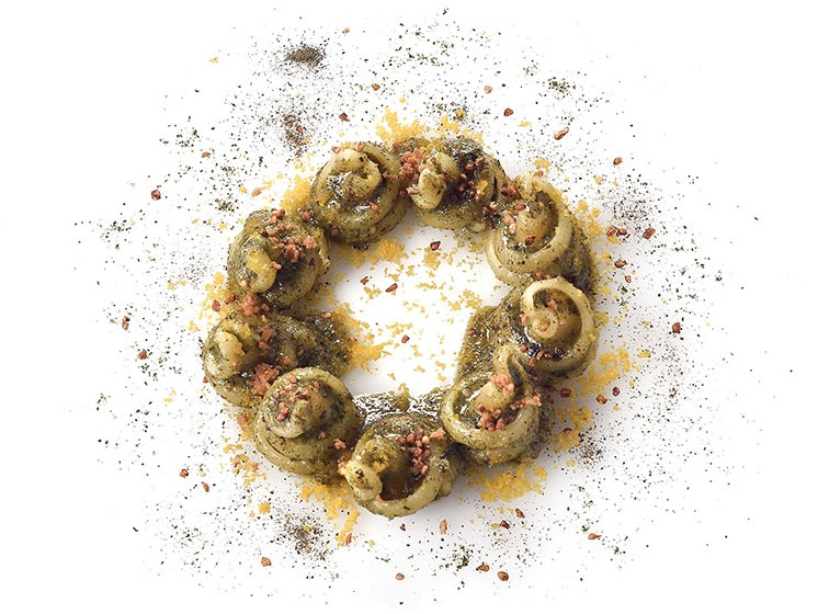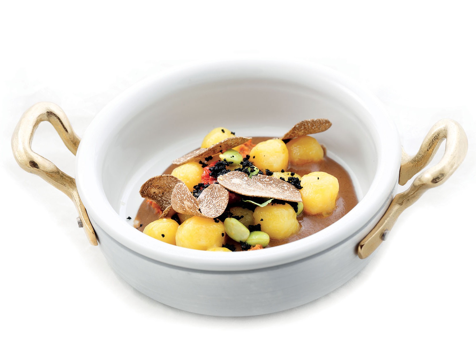 Gnocchetti crema all’aglio nero, ricci di mare, crumble al nero di seppia, pomodorini semisecchi e tartufo