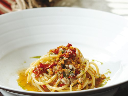 INGREDIENTI g. 320 di spaghetti g. 60 di filetti di alici fresche pomodori secchi 1 scalogno g. 30 di brodo di pesce Per il pesto g. 60 di pistacchi g. 40 di olio…