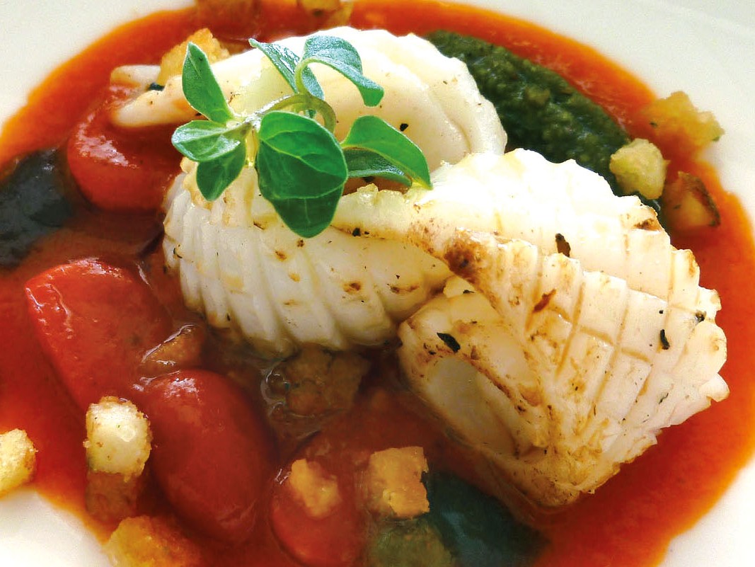 INGREDIENTI per 4 persone g. 700 di calamari, g. 600 di pomodorini del pendolo, 1 cipolla bianca, 2 spicchi d’aglio, 2 mazzetti di basilico, g. 60 di olive taggiasche, g. 10 di capperi…
