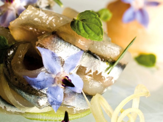 INGREDIENTI Per le alici: 40 piccole alici di lampara primaverili, g. 20 di rapatura di limoni, g. 20 di rapatura d’arancia, 40 steli teneri con foglia di timo, 30 foglie di menta, g.…