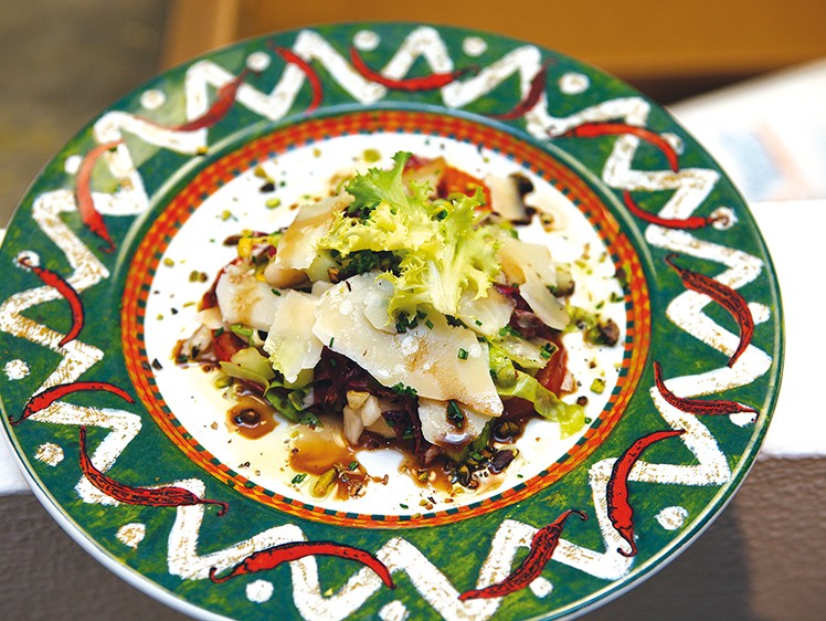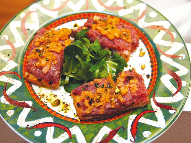 INGREDIENTI Ingredienti per 4 persone: g. 200 di tonno fresco, g. 80 di lardo di mora romagnola, 2 fette di melone, g. 50 di pistacchio tostato, g. 60 di soncino, 1 cucchiaio di…