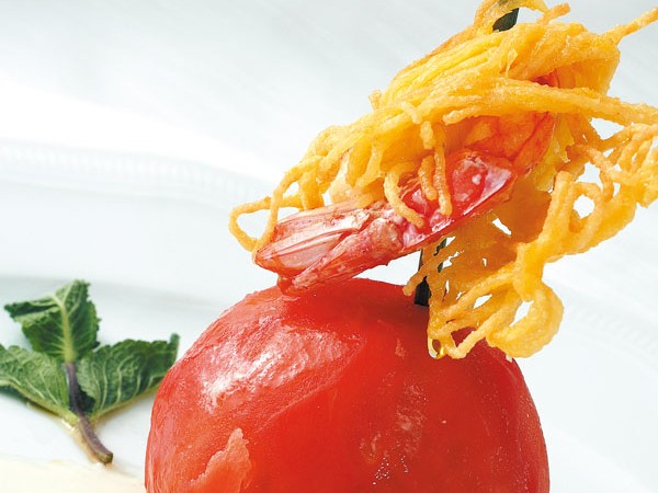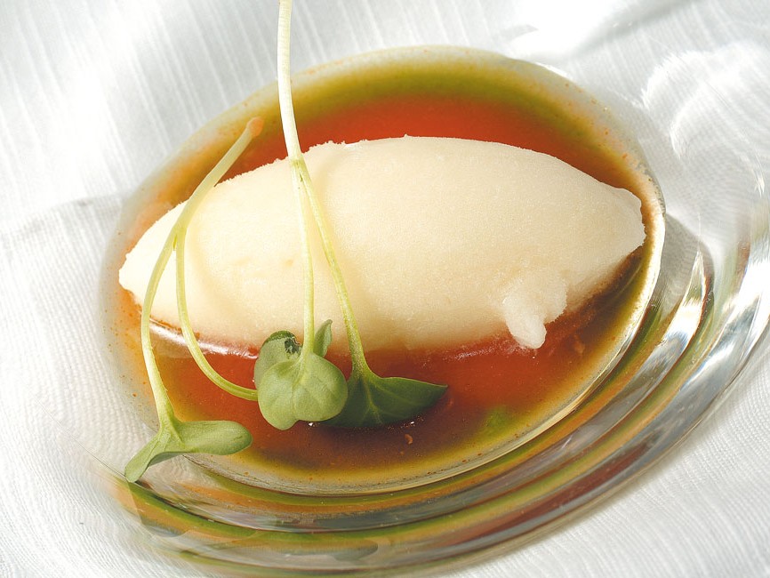 Ingredienti kg. 1 di pomodori pendolini, sale, pepe, basilico, gelatina xantanagum, olio d'oliva extravergine. Preparazione Pelare e privare dei semini i pomodorini; passarli al passaverdura e lasciarli riposare in frigo…