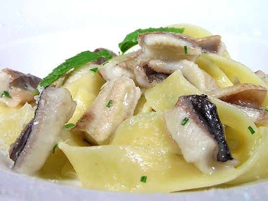 Ingredienti per 4 persone g. 400 di fettucelle, 1 grongo di circa kg. 1, g. 100 di pecorino giovane, foglie di alloro, 5 spicchi d’aglio, foglie di menta, olio extra vergine, sale e…
