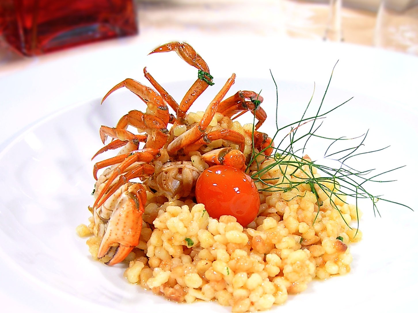Ingredienti per 4 persone g. 320 di fregula, g. 400 di granchietti di stagno, l. 1 di fumetto di pesce, sale, pepe, olio extravergine di oliva, prezzemolo, basilico, aglio, peperoncini e pomodorini. …