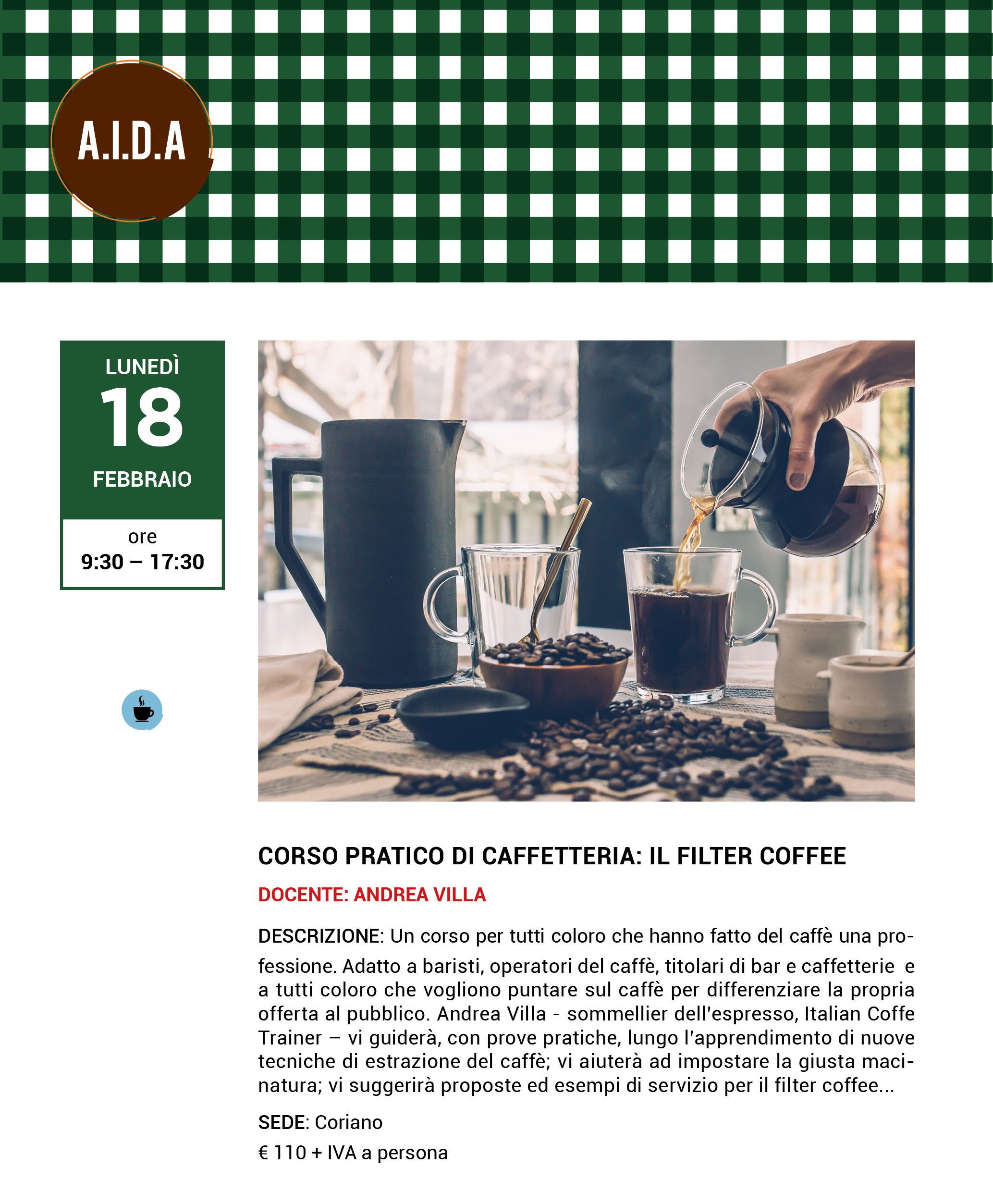 Un corso pratico per tutti coloro che hanno fatto del caffè una professione. Adatto a baristi, operatori del caffè, titolati di bar e caffetterie e a tutti coloro che vogliono puntare sul caffè per differenziare la propria offerta al pubblico. Andrea Villa – sommelier dell’espresso, Italian Coffee Trainer – vi guiderà, con prove pratiche, lungo l’apprendimento di nuove tecniche di estrazione del caffè; vi aiuterà ad impostare la giusta macinatura; vi suggerirà proposte ed esempi di servizio per il filter coffee…