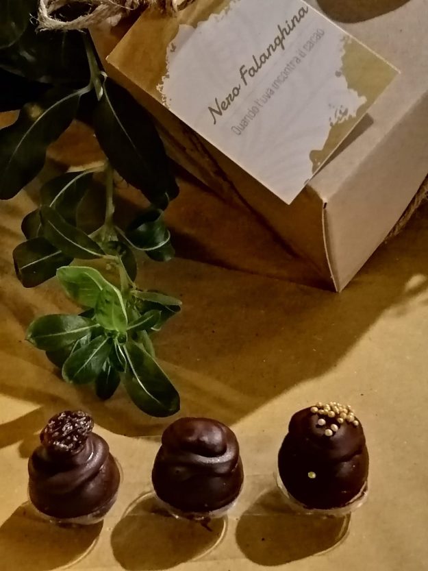 Tre cioccolatini dedicati alla “grappa di Falanghina”, al “passito di Falanghina” e al “vino Falanghina” in un packaging con materiali naturali Cacao e vino, un binomio vincente che da sempre ispira le fantasie…