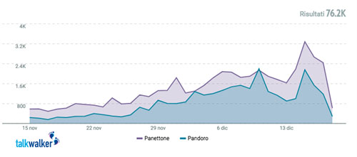 Artigianali oppure no, sono i classici panettone e pandoro a scalare tutte le classifiche guadagnandosi un totale di oltre 76mila mention sui principali social network dal 15 novembre a oggi, ma il re indiscusso dei dolci natalizi è il panettone. La specialità gastronomica di origine milanese raccoglie due terzi delle citazioni (oltre 47mila) rispetto a quelle del pandoro (29mila). Solo nella giornata del 10 dicembre, il boom degli ordini “social” di pandoro in supporto ai dipendenti di San Giovanni Lupatoto ha generato oltre 2,2 mila mention superando di poco il panettone (a quota 2,1mila).