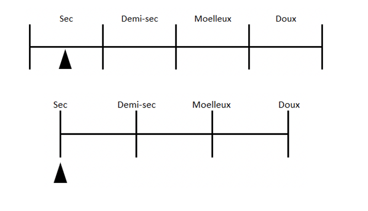 ** Demi-Sec : se il grado zuccherino del vino si situa al di là dei 4 g/l ma non è superiore ai 12 g/l (o 18 g/l se il grado di acidità totale espressa in grammi di acido tartarico per litro non è inferiore a più di 10 g/l al grado di zucchero residuo)