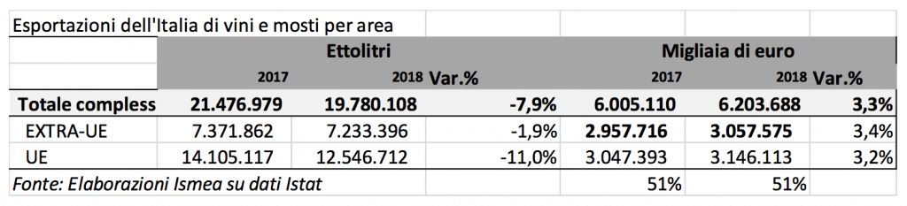 Il vino italiano nel 2018 è cresciuto del 3,3% in valore toccando i 6,2 miliardi di euro, mentre a volume, a causa della scarsa vendemmia del 2017 e una domanda piuttosto fiacca sui mercati, è sceso sotto la soglia dei 20 milioni di ettolitri (19,8 milioni hl), pari a circa l’8% in meno rispetto all’anno precedente.