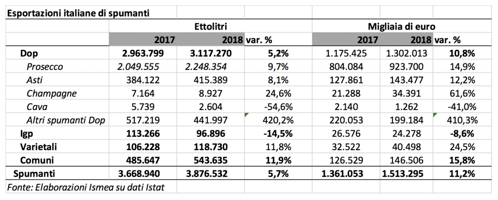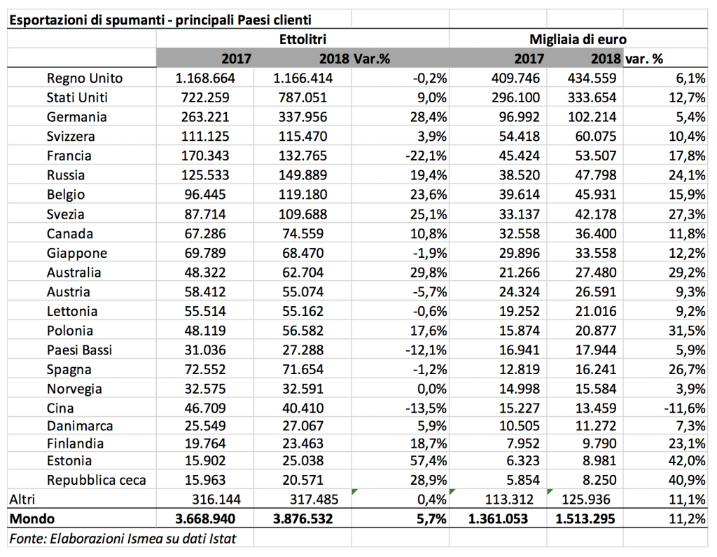 Traino del settore si sono dimostrati ancora una volta gli spumanti, con una robusta crescita dell’11,2% in valore (oltre 1,5 miliardi €) e un aumento vicino al 6% a volume (quasi 3,9 milioni di ettolitri), con il Prosecco che ha segnato il +15% a valore e il +10% a volume. I frizzanti, invece, sono rimasti stabili a volume, recuperando discretamente sulla componente del valore (+7%), grazie al buono stato di salute del mercato tedesco (+3% in volume e +12% in valore), primo importatore per questa tipologia di prodotti.